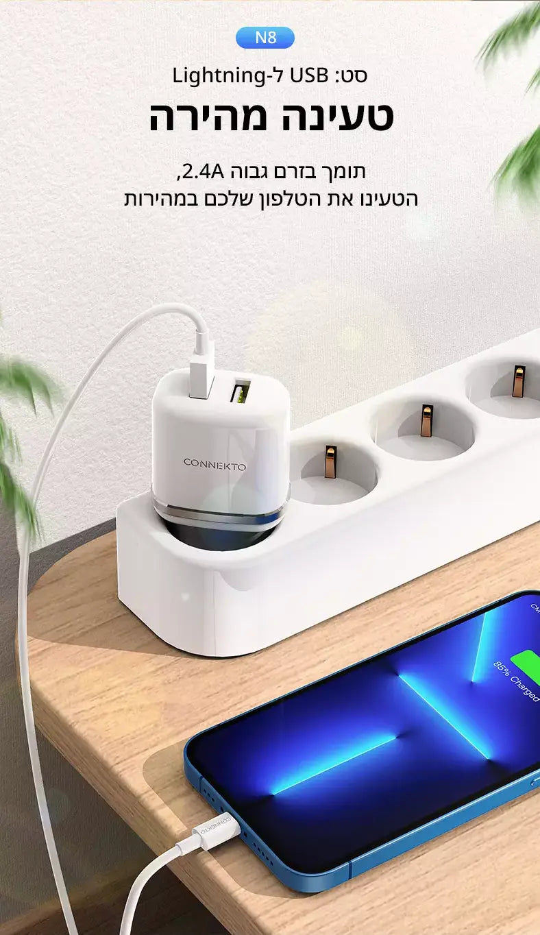 סט טעינה הכולל ראש מטען מהיר 2 יציאות USB-A וכבל USB-A ל-Lightning